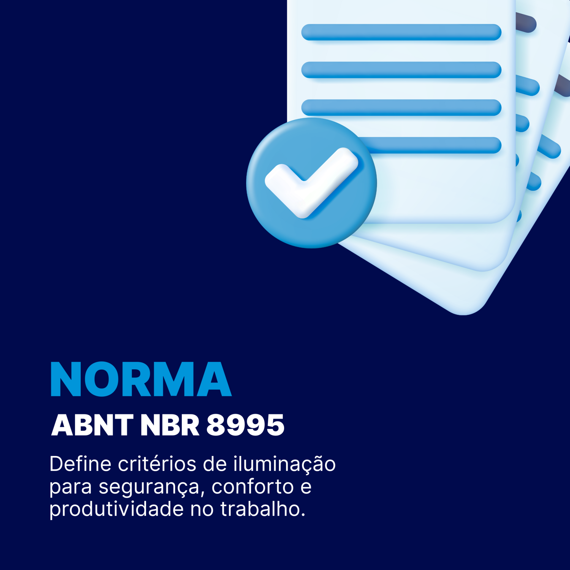 Uma delas, a NBR ISO/CIE 8995, define parâmetros de iluminação em ambientes de trabalho, promovendo conforto visual e eficiência.
